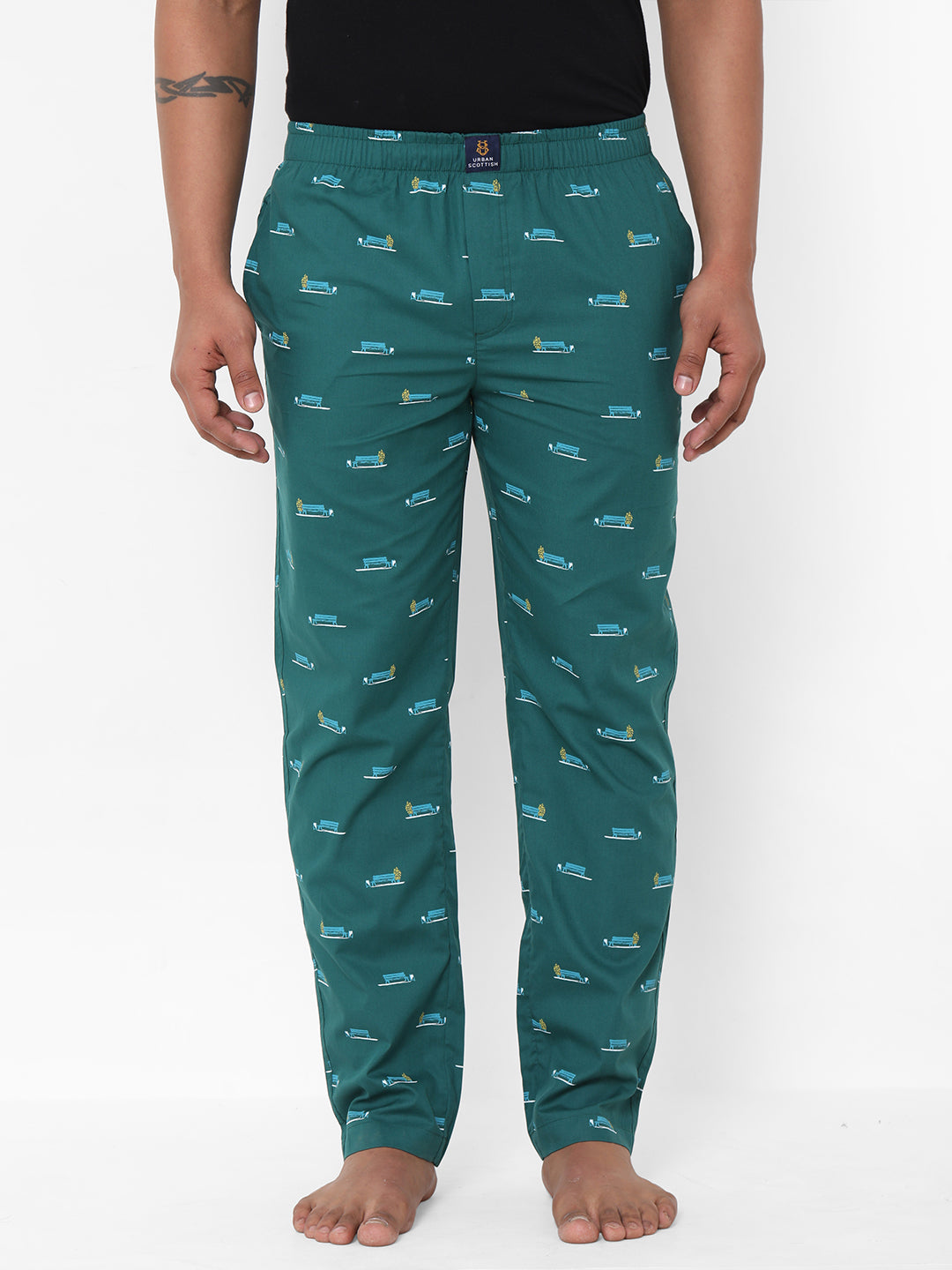 Upgrade your sleepwear collection by getting yourself these lovely pair of Green lounge pants from the latest collection of Urban Scottish. Featuring an elasticated waistband and two pockets on the sides giving it a functional touch. The waistband consists of the brand logo engraved on it. Adorned with a printed pattern all over, making it a fun choice. Crafted with pure cotton to assure a soft touch and a great comfort all day long. Team it with a solid t-shirt and slip-ons when you go out for a stroll.
