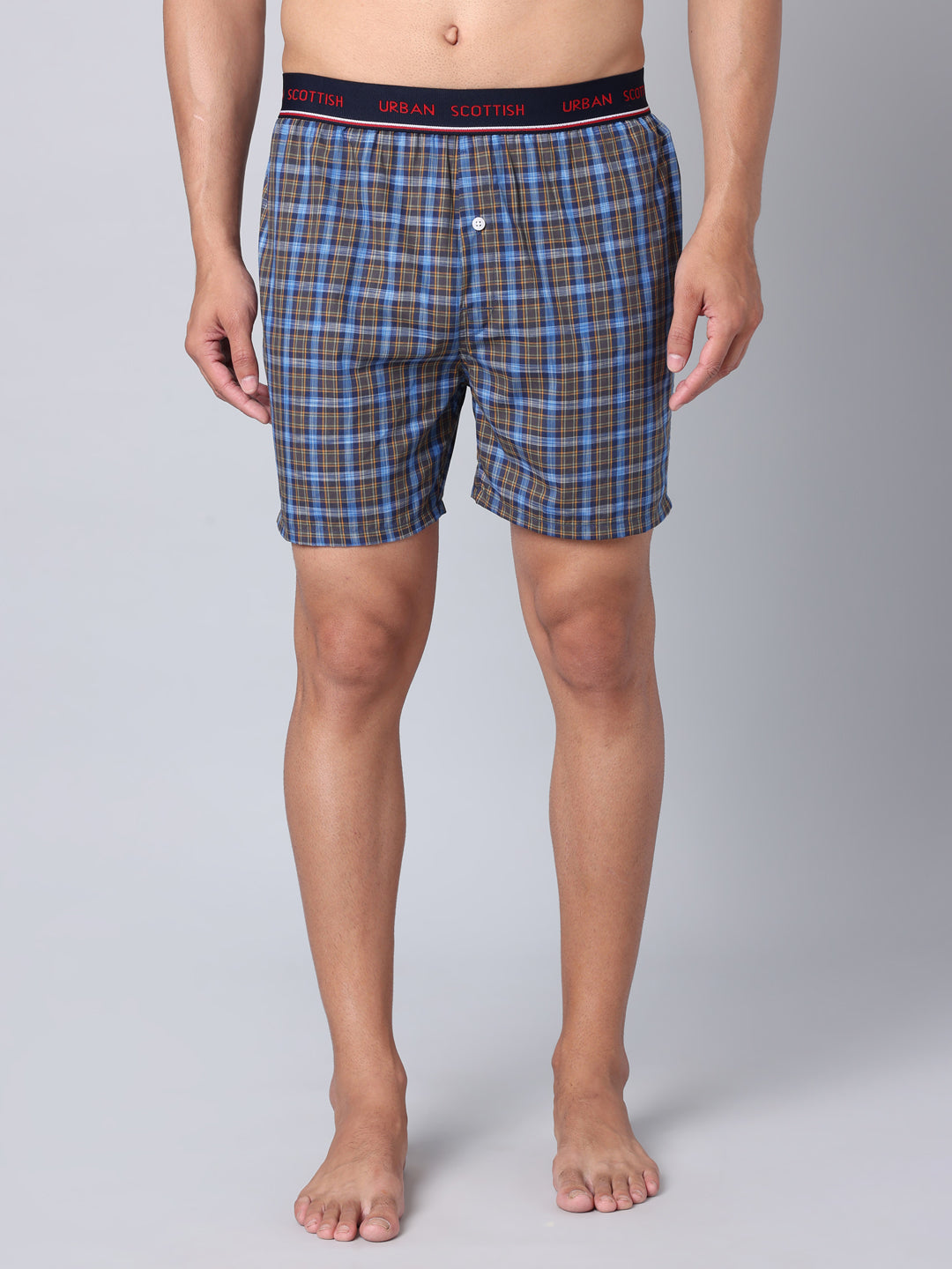 Introducing the Urban Scottish Men's Boxer, the perfect addition to your loungewear collection. Made with premium quality 100% cotton fabric, these boxers offer exceptional comfort and breathability for all-day wear. The regular fit and mid-rise design ensure a flattering look for all body types, while the outer elastic closure provides a secure and adjustable fit. Featuring a classic checks pattern in a stylish blue color, these boxers add a touch of sophistication to your outfit. The two Side Pockets design allows you to conveniently store your essentials, making them ideal for casual occasions or relaxing at home. Invest in the Urban Scottish Men's Boxer for unmatched comfort and style.