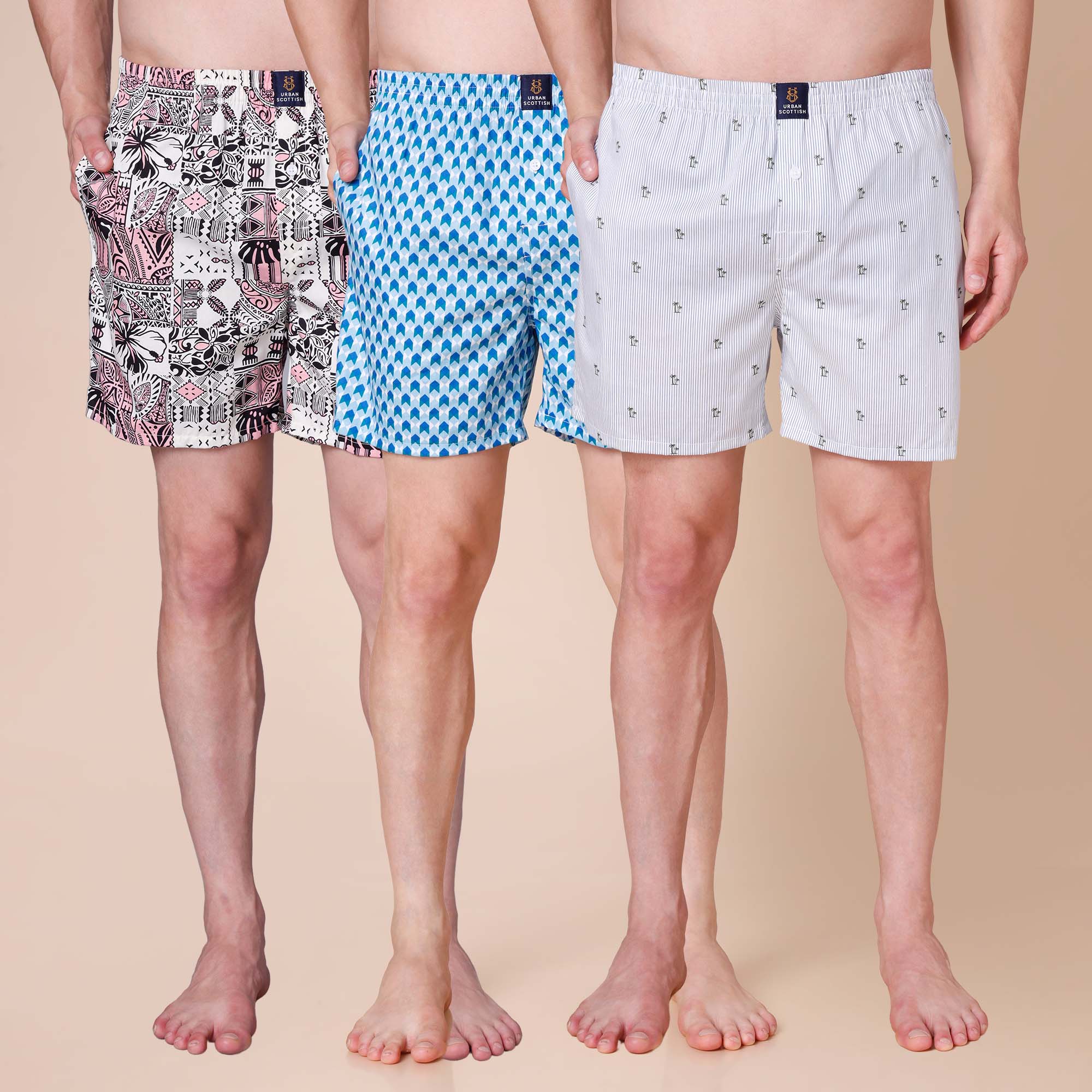 Men's Multicolor, 100% Cotton, printed, Regular Fit, Inner Elastic, Mid-Rise, Boxers- Pack of 3