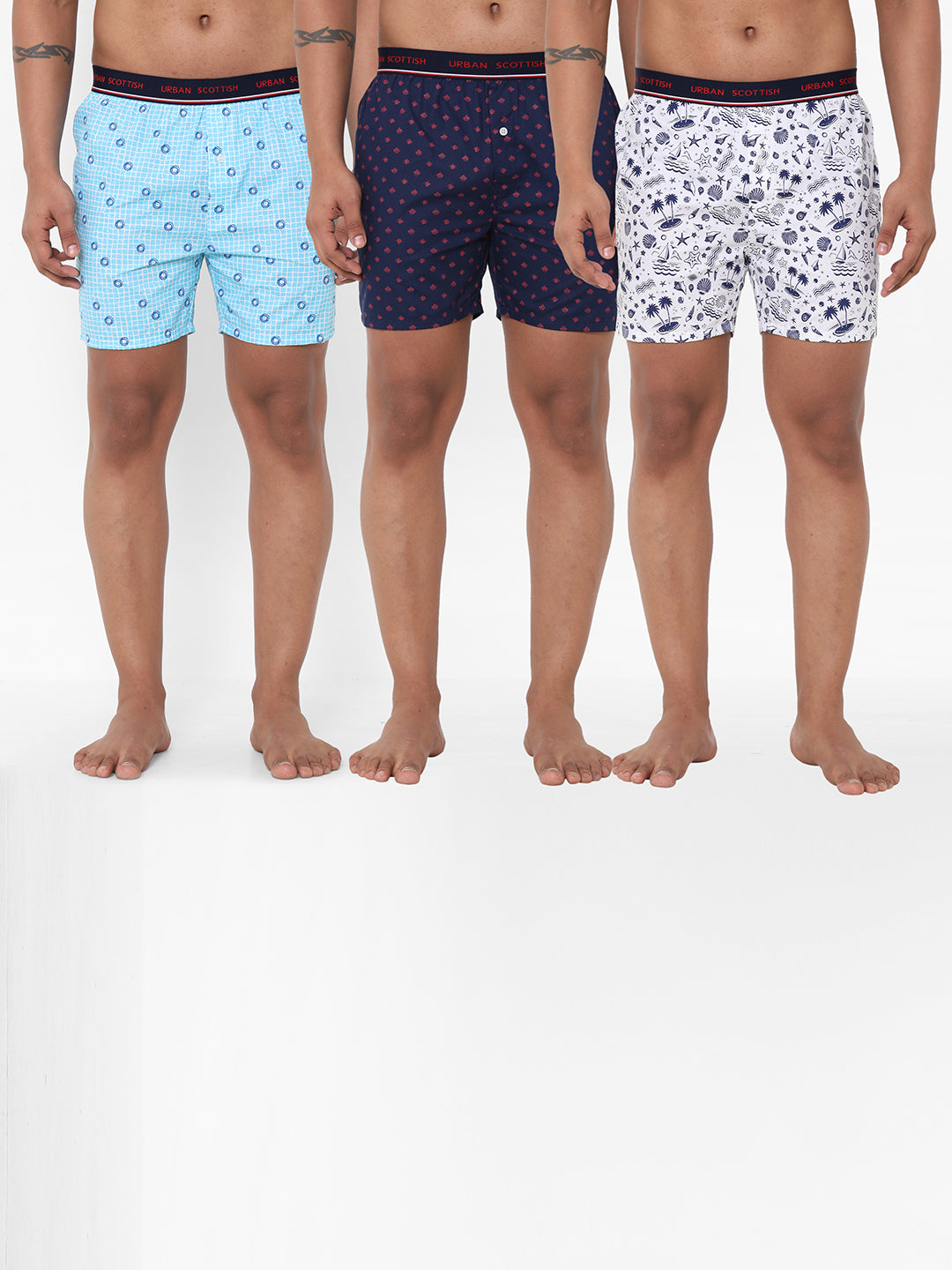Looking to update your bottoms wardrobe? Get these stylish and comfy pair of boxer from the brand Urban Scottish. It is a pack of three boxers. Each of them are designed with unique prints and feature an elasticated waistband for proper fitting. It comes with an attached logo of the brand on the waistband. The soothing colors are a must-have to your casual collection. Offers a regular fit and has a length above-knees. Made with pure cotton, it assures complete breathability and a comfort like no other. Team it with a solid t-shirt and slip-ons when you step out for a walk.
